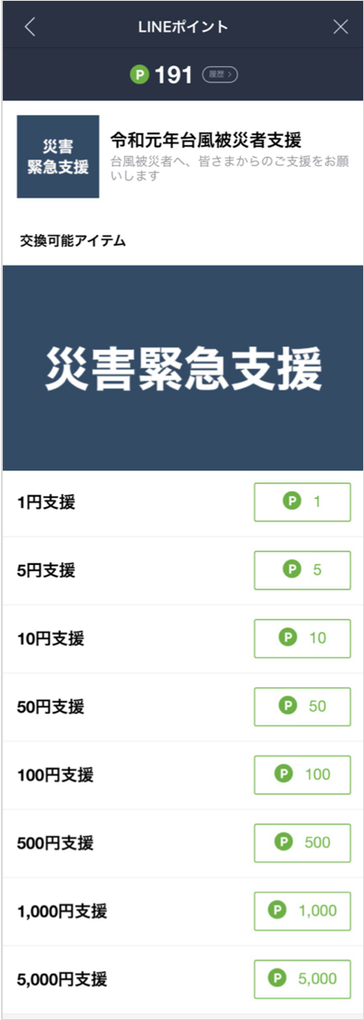 「LINEポイント」に貯まっているポイントを、1ポイント=1円に換えて寄付をすることができます。