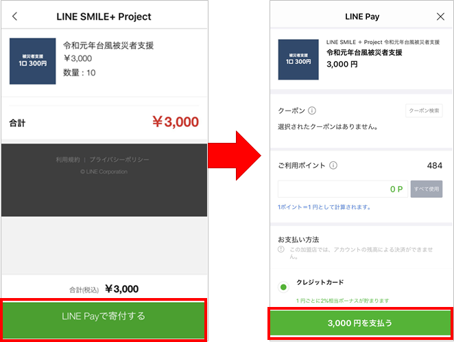 3、内容を確認し、「LINE Payで寄付する」ボタンを押し、クレジットカードでの決済を選択します。
