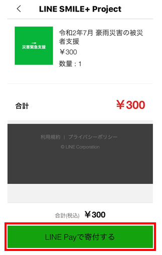 3、内容を確認し、「LINE Payで寄付する」ボタンを押します。(LINE Payユーザーでない方は、この画面でクレジットカード情報の入力と利用規約の同意をします)
