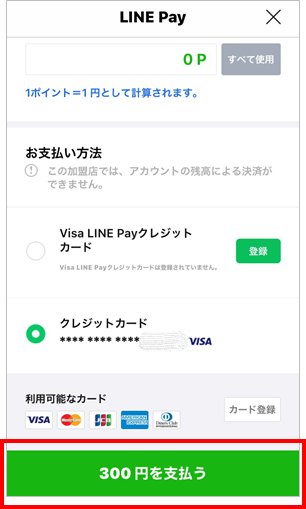 4、クレジットカードでの決済を選択、LINEポイントからの充当もできます。最後に「XXX円を支払う」ボタンを押します。