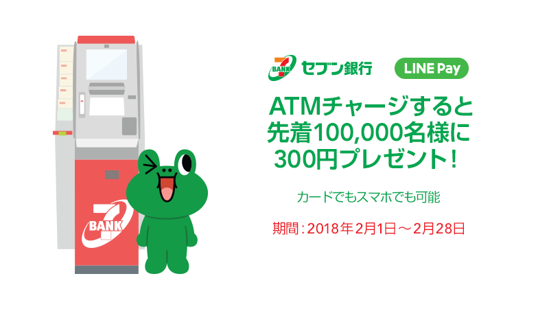LINE Pay キャンペーン 2018年02月01日 【LINE Pay】先着10万名様に300円プレゼント!セブン銀行ATMでチャージしよう♪ ※LINE Payに関する記事は「LINE Pay公式ブログ」に移行しました※全国24,000台以上のセブン銀行ATMで、期間中に総額3,000円以上をチャージすると先着10万名様にLINE Pay残高300円分をプレゼントするキャンペーンを本日から2月28日(水)まで開催します。セブン銀行の口座を持